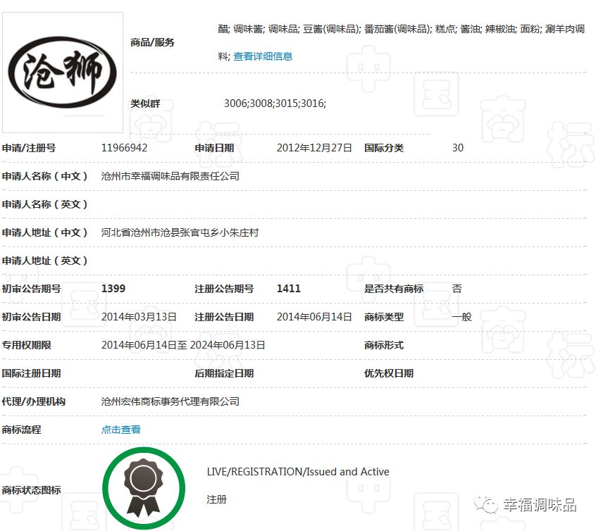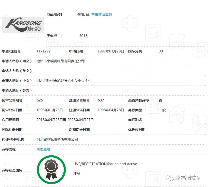 幸福調(diào)味品自創(chuàng)辦30多年以來,在工商部門指導(dǎo)下,充分認識到商標品牌的重要性,始終堅持走創(chuàng)品牌的路子。公司的“康頌”商標于1997年在30類,糖、茶、糕點、調(diào)味品類獲核準注冊后,并根據(jù)市場需要,先后又注冊了包括“滄獅”中文及拼音在內(nèi)的等商標;形成了涵蓋多類別、多商品、多層次的商標品牌庫。